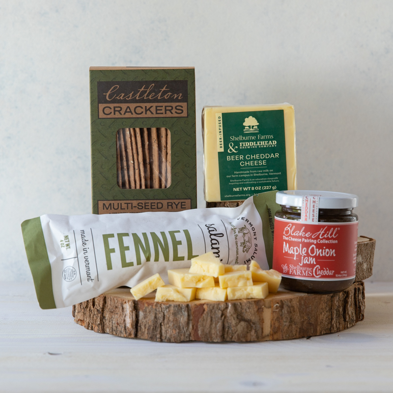 Our beer cheddar is infused with Shelburne’s own Fiddlehead Brewing Company’s flagship IPA. Fennel Salami, crafted by Vermont Salumi, includes coarse-ground fennel seeds to create sweet and savory flavor notes. Blake Hill Maple Onion Jam and Castleton Rosemary Crackers provide the perfect accents to this flavorful combination.