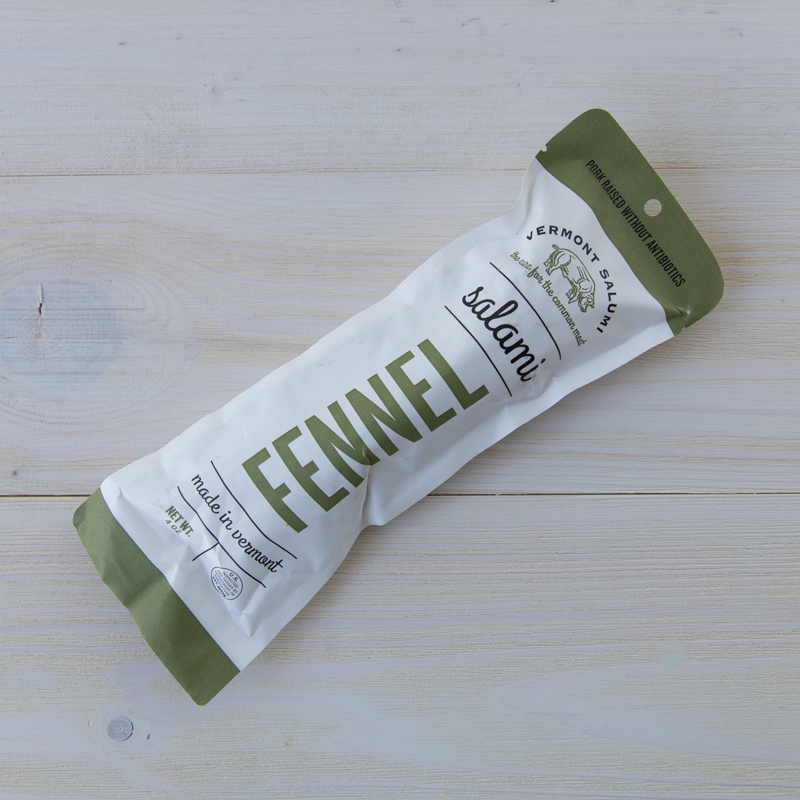 Crafted by Vermont Salumi and made with antibiotic-free, fresh ground pork, this rich and aromatic salami includes coarse-ground fennel seeds to create sweet and savory notes that brighten up any charcuterie board. (4 oz)